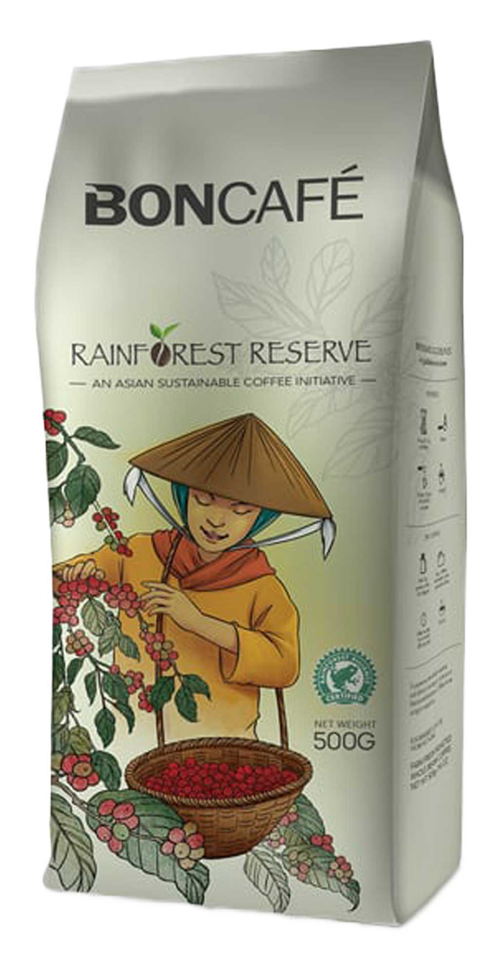 This Asian coffee blend from Vietnam's Da Lat and Dak Lak regions. Sourced from Rainforest Alliance Certified farms, the beans reflect Boncafé's commitment to sustainable coffee. Farmers are trained in responsible cultivation practices that protect the land, support farming communities, and can improve yields over time.